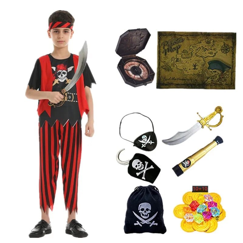 ✅ Inclus Tout Ce Dont Vous Avez Besoin : Notre ensemble comprend un haut de pirate, un pantalon, un bandana, un cache-œil de pirate, une longue-vue, des pistolets, une carte d’aventure, un sabre de pirate, et même un sac de pièces. Votre petit aventurier sera prêt à partir à la chasse au trésor dès qu’il enfilera ce costume.
