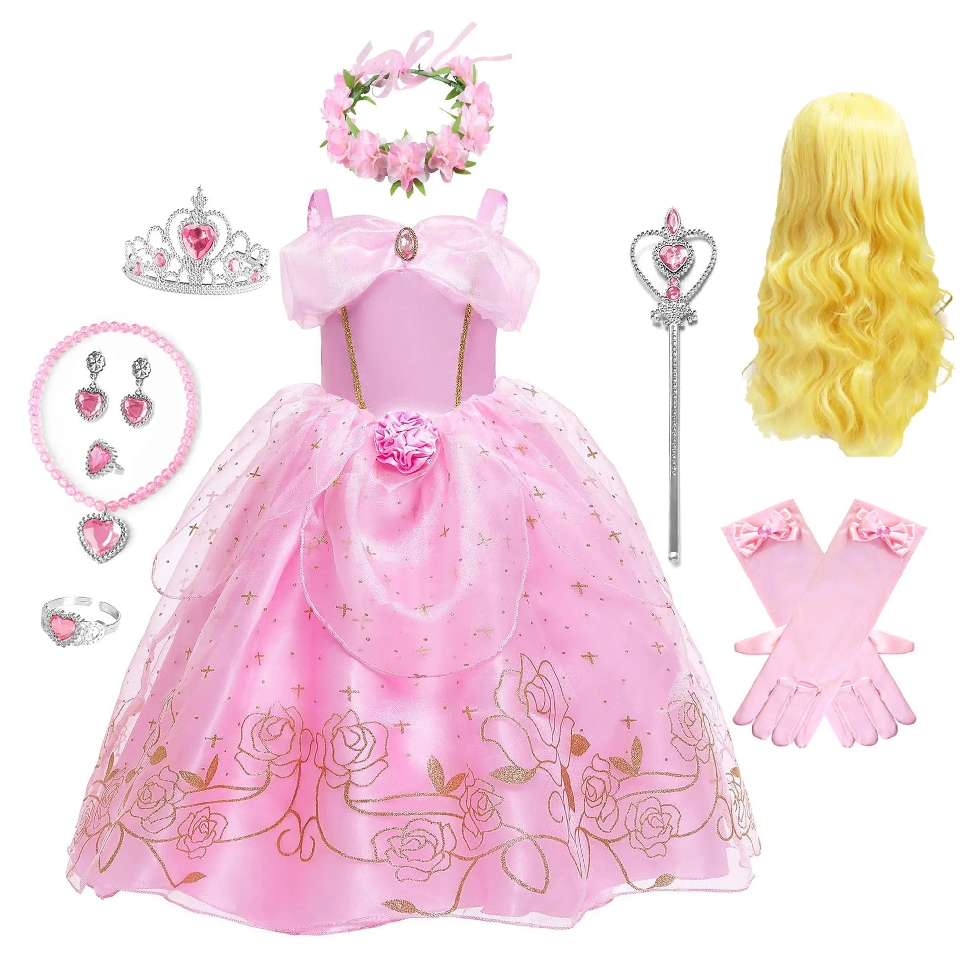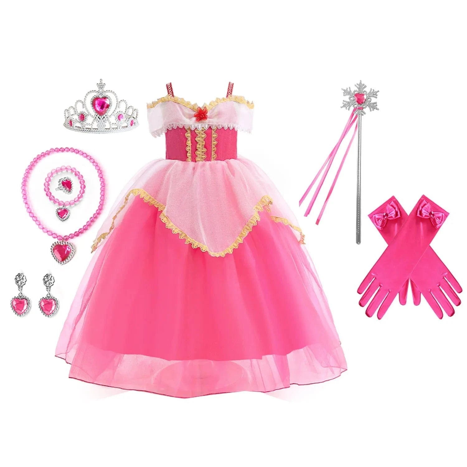 - Contenu : Robe de princesse + accessoires (couronne, baguette, gants).