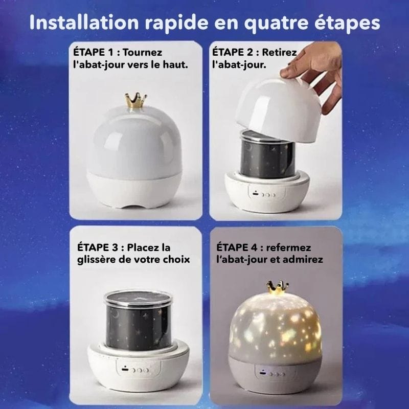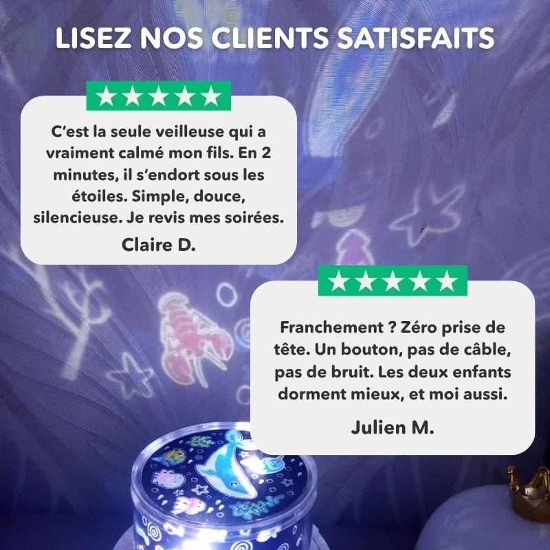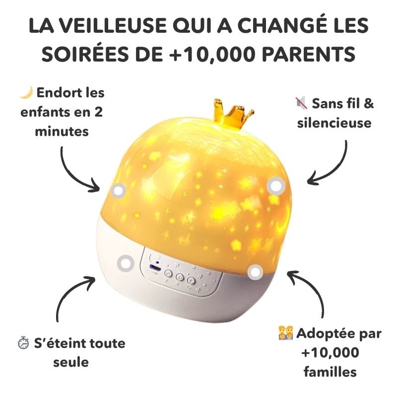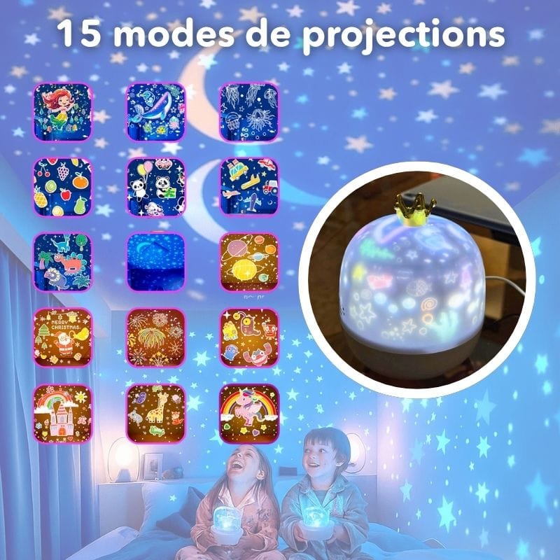 Offrez à vos enfants des nuits magiques avec la Lampe Projecteur Enfants 2-en-1. Avec ses 21 thèmes interchangeables (étoiles, animaux, fêtes, fonds marins…), elle transforme la chambre en un univers apaisant et enchanteur. Facile à utiliser, sécurisée et polyvalente, elle sert à la fois de projecteur immersif et de veilleuse douce pour un endormissement serein. Idéale comme cadeau pour enfants, elle crée un rituel du coucher unique qui réduit le stress et stimule l’imagination. Garantie 30 jours satisfait ou remboursé.